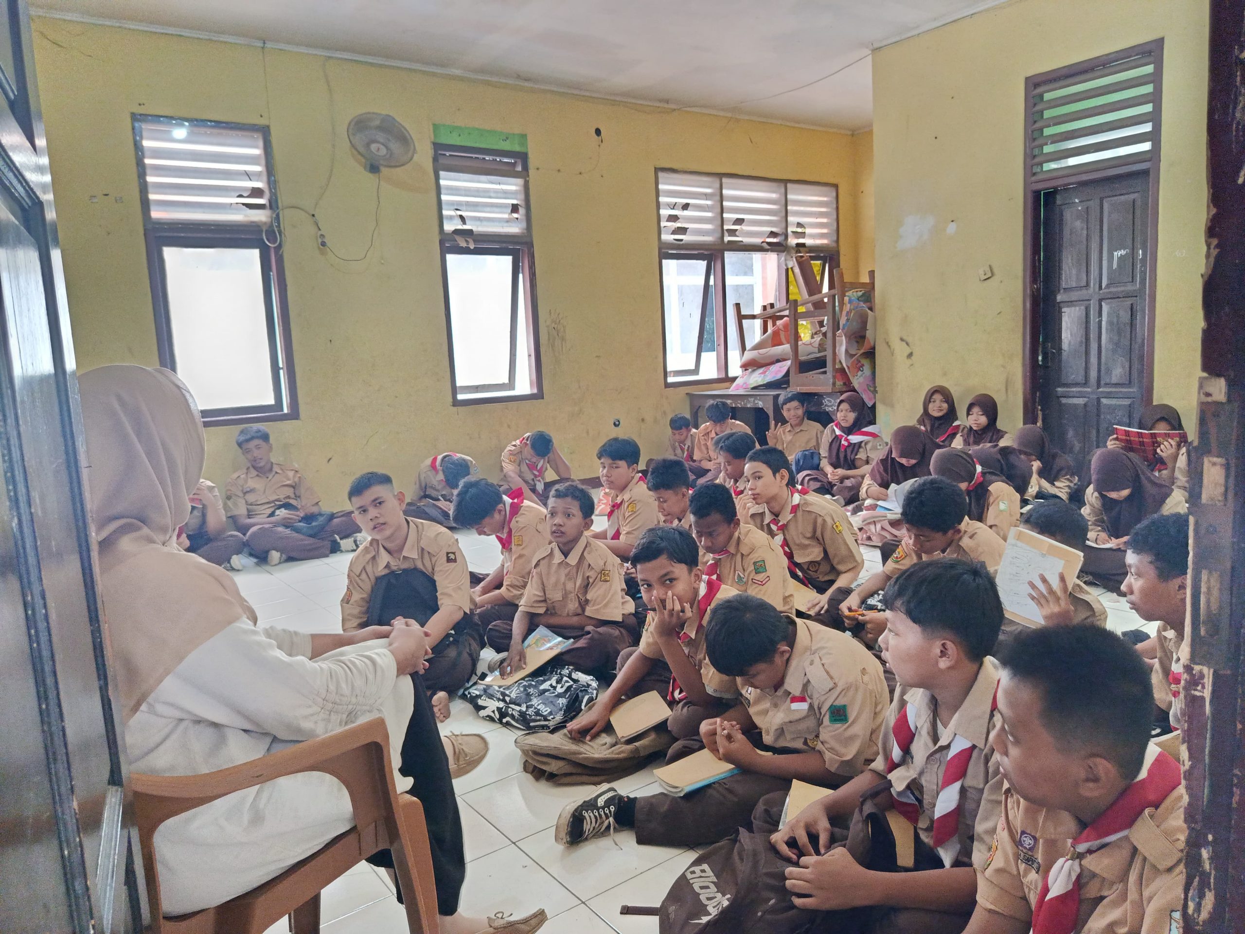 Tidak hanya itu, murid di beberapa ruang kelas bahkan terpaksa belajar dengan kondisi lesehan.